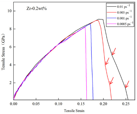 When the simulated strain rate is between 0.0005 ps−1 and 0.01 ps−1, the stress–strain curve of the Cu-0.2Zr/Al2Cu/Al layered heterostructure exhibits several fluctuations during the initial stage of strain increase in the elastic deformation region. As the tensile strain continues to increase, the Cu-0.2Zr/Al2Cu/Al layered heterostructure transitions into the plastic deformation region. Following the attainment of the ultimate tensile strength, the stress rapidly declines to zero, resulting in overall fracture. Conversely, when the strain rate ranges from 0.005 ps−1 to 0.01 ps−1, the stress–strain curve in the initial stage of strain increase does not exhibit fluctuations. As the tensile strain continues to rise, the Cu-0.2Zr/Al2Cu/Al layered heterostructure also enters the plastic deformation region. After reaching the ultimate tensile strength, the stress decreases gradually in a step-like manner, as indicated by the red arrow in Figure 12. This behavior suggests that interface separation and delamination fracture occur in the composite material during the stretching process.