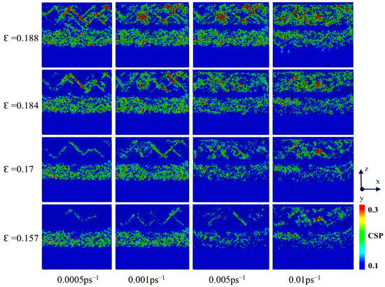Figure 13 illustrates the atomic stress diagram during the stretching process at various strain rates. The results indicate that at low strain rates of 0.0005 ps−1 to 0.01 ps−1, dislocations initially begin within the intermetallic compound (IMC) Al2Cu layer as the model gradually approaches its ultimate tensile strength under tensile load. In the early stages of stretching, the dislocation motion is relatively slow, allowing atoms sufficient time to move and rearrange in response to external strains. As the strain increases, the dislocation density in the Al layer progressively increases, leading to the formation of dislocation tangles that impede dislocation movement, resulting in local stress concentrations and serving as a source for crack initiation. When the applied tensile stress surpasses the local strength of the material, microcracks begin to form and propagate. Given that the fracture strength of copper exceeds that of aluminum, cracks preferentially occur within the aluminum matrix. Furthermore, aluminum exhibits a typical face-centered cubic crystal structure, which possesses numerous slip systems, thereby providing good plasticity and a propensity for substantial plastic deformations. In contrast, the Al2Cu layer is relatively brittle, making it susceptible to grain boundary or transgranular fractures. Additionally, there is a coupling effect at the phase interface between the Al2Cu layer and the copper–aluminum matrix. This structural characteristic enhances the bonding strength and deformation coordination of the Cu-0.2Zr/Al2Cu/Al composite. Consequently, the stress–strain curve exhibits multiple fluctuations during the initial stages of tension. After reaching the ultimate tensile strength, the material fails as a whole, resulting in a rapid drop in stress to zero. This behavior aligns with the observed trends in the stress–strain curve during the vertical interface tensile deformation process of the Cu/Al2Cu/Al layered heterostructure [29].