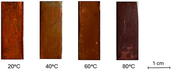 Figure 1 and Figure 2 show macroscopic images and reflectance spectra, respectively, of samples treated using method A (Im). Reflectance spectra (Figure 2) of samples treated at 20 °C and 40 °C exhibit a dominant wavelength at 650 nm. However, samples treated at 60 °C and 80 °C, corresponding to the surface changes observed in Figure 1, show a decrease in overall reflectance with increasing temperature and a sharp decrease in reflectance near 570 nm. The pure bulk Cu2O has is band gap of about 2.1 eV. It corresponds to about 570 nm wavelength. The defects as well as strains may shift the absorption edge value. Starting from this value, a sharp decrease in reflectivity begins to occur. This latter feature is due to the increased presence of oxides on the surface [52]. The enhanced formation of oxides leads to a darkening of the surface. Specifically, the sample immersed in the solution heated at 20 °C possesses an orange-brown hue similar to the elemental copper and, according to reflectance analysis (Figure 2), this sample shows the lightest hue among other samples. The presence of black areas on the surface indicates the growth of an inhomogeneous oxide layer. Samples immersed in solutions heated at 40 and 60 °C develop a more homogeneous oxidation layer while retaining an orange-brown hue. However, they appear darker compared to the sample treated at 20 °C. The sample immersed in the solution heated at 80 °C shows a dark, purplish-brown surface. The hue observed in samples treated at 20, 40 and 60 °C is characterized by varying degrees of orange-red-brown hue, suggesting the formation of a cuprite layer [53] on the surface accompanied by tenorite or paramelaconite, as indicated by a decrease in reflectance. The sample treated by immersion at 80 °C was prevalently characterized by a darkish appearance, suggesting an increasing possibility of tenorite formation.