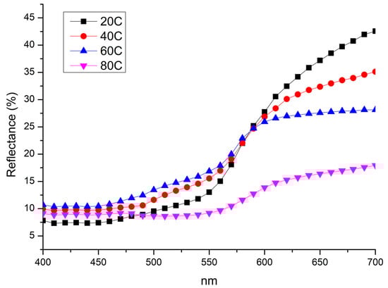 Reflectance spectra collected on samples treated by immersion in NaOH 10% at 20 °C (20C); 40 °C (40C); 60 °C (60C); and 80 °C (80C).