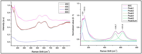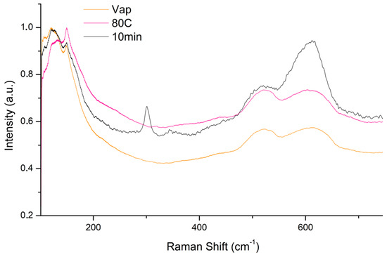 µ-Raman analyses were performed on extended darker areas on the sample surface to investigate the nature of Cu-oxide film (Figure 1 and Figure 2). All compared spectra were normalized from 0 to 1 (minimum–maximum intensity value normalization). Spectra acquired on sample obtained at 80 °C (Figure 3) is characterized by peaks at 151, 516, and 611 cm−1. Peaks at 151 and 516 cm−1 are attributable to Cu2O [54,55] while at 611 cm−1 present in the sample spectrum can be traced back to the Cu2O peak positioned at 634 cm−1. Shift from 634 to 611 cm−1 associated with the enlarged peak shape suggests a poor crystallization of the Cu2O phase [56,57].