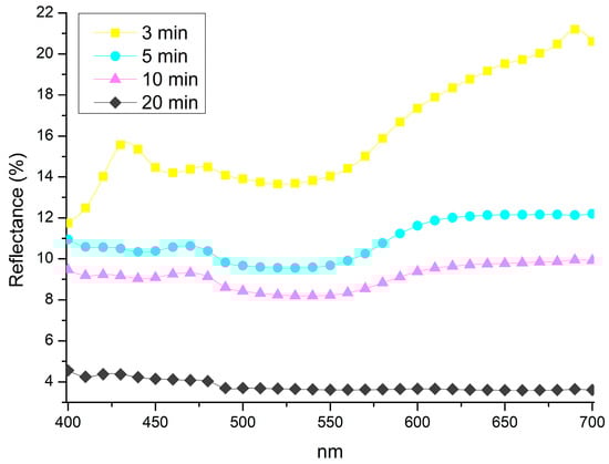 The results obtained using method B are presented below. The reflectance spectra (Figure 4) indicate that longer exposure times promote the formation of a darker patina. The spectrum recorded at 3 min exhibits spectral features at 425, 475, and 650 nm. At 5 and 10 min, the spectra display an increasingly linear trend, which becomes more pronounced at 20 min, where the surface develops a nearly colourless appearance, ultimately resulting in a deep black coloration.
