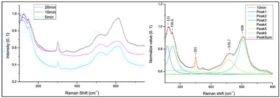 To define the composition of darker oxide, µ-Raman spectra were collected from treated samples with method B at 5, 10 and 20 vapour exposition time. Samples exposed to vapour for 3 min were excluded due to the absence of blackish hue and relative tenorite formation, as confirmed by µ-Raman and colorimetric results obtained from method A. All spectra from the selected treated samples with method B are characterized by the presence of similar main peaks (Figure 5), although the ratio of peak intensities is different in relationship to the exposition time. The main peaks are at 121, 156, 301, 515, and 606 cm−1. The highest intensity of the peaks at 301 and 606 cm−1 is assigned to the sample treated for 1 min of immersion and 10 min exposure to NaOH 10% solution. Peaks at 301 cm−1 are due to a shift in the main characteristic CuO peaks at 297–298 cm−1 [32,36,58]. The peak at 515 cm−1 is attributable to the intrinsic violation mechanism of selection rules in Cu2O phonon frequencies during structure orientation passage into paramelaconite Cu4O3 [59], but it is also attributed to CuO [60,61]. Support for attributing this peak to paramelaconite is reported in the study of Jagadish et al. [62] where the peak at 532 cm−1 is caused by Raman-allowed paramelaconite crystals’ mode. The peak at 606 cm−1 can be attributed to a Cu-O stretching mode [59] shifted from 602 cm−1, and similar to the previous samples. The variation in the shape of the latter peak indicates changes in the crystal structure induced by the temperature dependence of formation [32,60,61,62].