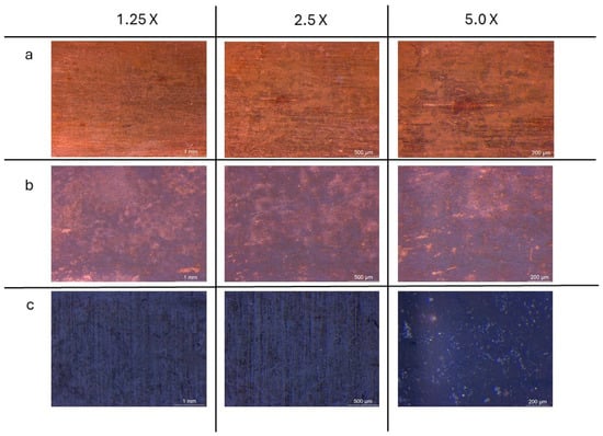 OM images of surface samples from samples treated with vapour exposition treatment (a); immersion treatment (b) and combining immersion and vapour exposition treatment (c), observed at 1.25×, 2.5× and 5.0× magnification.