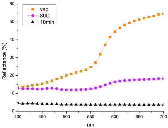 Comparison of reflectance data collected from samples treated only by vapours exposition (Vap), samples treated only by immersion treatment (80C) and samples treated by combining immersion and exposition treatments (10 min).