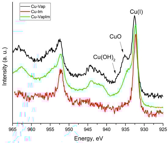 where BE (Cu 2p3/2) is the BE of the core level Cu 2p3/2, while KE (Cu LMM) is the kinetic energy of the photo-induced Auger transition. The obtained value α′ = 1849.1 ÷ 1849.6 eV suggested that Cu was oxidized to +1, rather than being metallic. However, in the other samples, an adjunctive component was found, as a consequence of these treatments, at BE = 934.2 eV and 935.6 eV, was assigned to CuO and Cu(OH)2, respectively, characterized also by their typical satellite peaks located at higher BE (Figure 9) [63].