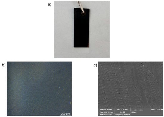 The images acquired through secondary electron (SEM-SE), with 10 µm resolution, reveal a highly homogeneous and uniform oxide layer on the sample surface (Figure 10c). The presence of scratches, due to the initial polishing of the sample surface with SiC paper, still remains visible.
