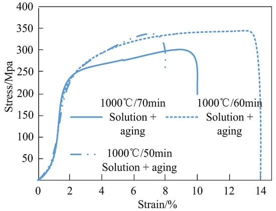 Figure 3 illustrates the stress changes in the sample after tensile treatment using heat treatment technology under the process parameters of 1000 °C/50 min, 1000 °C/60 min, and 1000 °C/70 min. The results are shown in