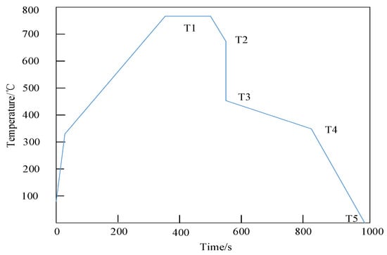 Figure 5 shows that during the continuous annealing process, T1 is the isothermal annealing temperature, at which the internal atoms of the material obtain sufficient energy to diffuse, eliminate some internal stresses, and homogenize the structure. T2 is the slow cooling temperature, and controlling the cooling rate can affect grain growth and microstructure transformation; a slower cooling rate is beneficial to forming coarse and uniform grain structures. T3 is the rapid cooling temperature, which can suppress the precipitation of certain unfavorable phases and obtain a specific microstructure. T4 is the over-aging temperature, which can further grow and aggregate the precipitated phase and adjust the mechanical properties of the material. T5 is the final cooling temperature, which cools the material to room temperature to complete the entire annealing process. The time of each stage is precisely controlled based on the material properties and experimental objectives to achieve the optimization of the microstructure and properties of the material. During rapid cooling, the undercooling of the weld metal is high, the nucleation rate is high, but the growth rate is limited; a fine-grain structure can easily form, which increases the hardness and strength of the weld but reduces its toughness. When slowly cooled, atoms have enough time to diffuse, which is conducive to the formation of a coarse-grain structure. At this time, the strength and hardness of the weld are lower, but the plasticity and toughness are better.
