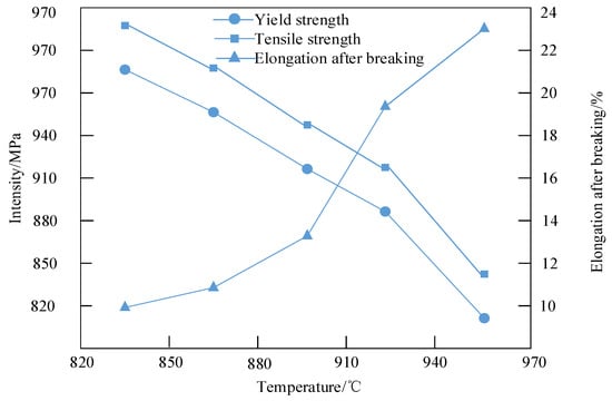 Figure 7 shows that below 890 °C, an increase in annealing temperature corresponds to a significant decrease in yield strength and tensile strength, with a substantial increase in elongation after fracture. This is due to the considerable microstructural changes, including recrystallization and grain polygonization. The reduction in work hardening from cold rolling decreases yield strength and tensile strength while increasing elongation after fracture. Above 890 °C, the yield strength and tensile strength of the sample continue to exhibit a decreasing trend with the increase in annealing temperature, but more gently and stably.