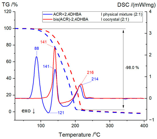 TG curve (dashed) and DSC curve (solid) of the bis(acridine)–2,4-dihydroxybenzaldehyde (red line) compared to the corresponding physical mixture of acridine and 2,4-dihydroxybenzaldehyde (blue line).