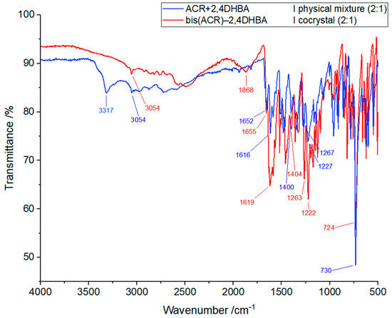 ATR-FTIR spectrum of bis(acridine)–2,4-dihydroxybenzaldehyde (red line) compared to the corresponding physical mixture of acridine and 2,4-dihydroxybenzaldehyde (blue line).