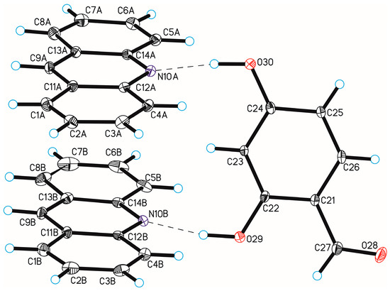 The SCXRD experiment shows that the obtained compound crystallizes as cocrystal in the noncentrosymmetric P21 monoclinic space group, with two molecules of acridine and one molecule of 2,4-dihydroxybenzaldehyde in the asymmetric unit (Figure 3 and Table 1). The title compound is not isostructural with the recently studied cocrystals acridine–3-hydroxybenzaldehyde (triclinic P-1) and acridine–4-hydroxybenzaldehyde, which crystallize in the monoclinic P21/c space group [32]. The C–O bond lengths in the hydroxyl groups of the benzaldehyde molecule are 1.32 Å, while the C12–N10–C14 valence angles in the acridine molecules are 119.7° and 118.7°, which confirm that proton transfer does not occur between the hydroxyl groups of benzaldehyde and the endocyclic N-atom of acridines [31,50]. In the cocrystals of acridine with 3-hydroxybenzaldehyde and 4-hydroxybenzaldehyde, these values are similar (1.36 Å and 119.1°, 1.35 Å and 118.8°, respectively). As we previously showed [50], the C12–N10–C14 angle ranges of 118° to 120° are characteristic of acridine cocrystals, whereas they range from 123° to 124° for acridinium salts.