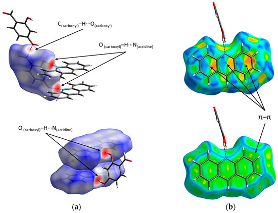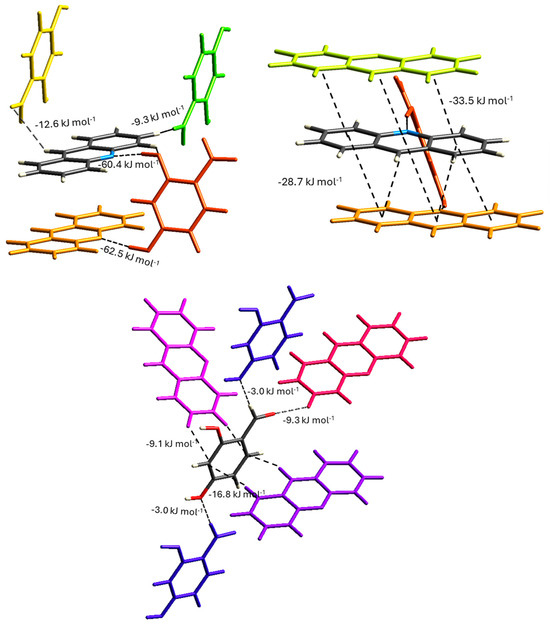 The total interaction energies between molecules indicate that the O(carboxyl)–H···N(acridine) interactions are the strongest in the crystal lattice, with values of −60.4 kJ/mol for O29–H29···N10B and −62.5 kJ/mol for O30–H30···N10A. The interactions between acridine molecules involved in stacking interactions (−28.7 kJ/mol for stacking within a trimer and −33.5 kJ/mol for stacking between trimers) are the most prominent for the above-mentioned antiparallel columnar motif. These total energy differences between acridine rings may result from the asymmetry in π electron cloud distribution, leading to uneven charge delocalization and further explaining the noncentrosymmetric nature of the cocrystal [54,55]. In contrast, for the zig-zag motif, the total energy of the C3B–H3B···O28 hydrogen bond is relatively low (−9.3 kJ/mol) compared to that of the antiparallel columnar motif, suggesting that the motif is the dominant structural feature. Selected energy interaction values between molecular pairs are presented in Figure 9 and summarized in Figure S2.
