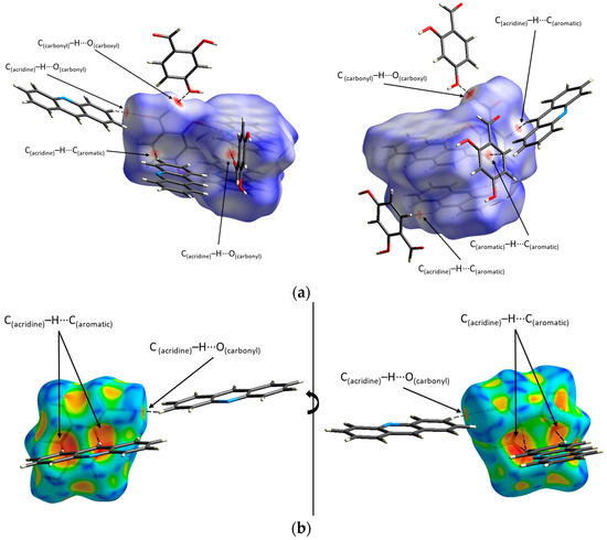 MEP calculations are a valuable tool for identifying molecular sites involved in electrophilic and nucleophilic interactions, as well as for studying molecular reactivity and the relationship between structure and reactivity [56,57]. The MEP surface mapping of the title cocrystal reveals that the regions of negative electrostatic potential are primarily concentrated around the oxygen atoms, which act as acceptor sites in the formation of C(carbonyl)–H···O(carboxyl) and C(acridine)–H···O(carbonyl) hydrogen bonds (Figure 11). Similarly, the positive electrostatic potential regions are concentrated over the acridine H atoms, which indicates the formation of the C(acridine)–H···O(carbonyl) hydrogen bond, weak C(acridine)–H···C(aromatic) and C(aromatic)–H···C(aromatic), and van der Waals interactions.