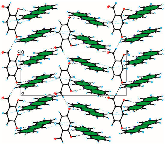 Additionally, π–π interactions, with d(Cg···Cg) distances ranging from 3.695 to 3.917 Å, occur between the aromatic rings of acridine moieties, linking independent trimers. As a result, structural motifs of antiparallel columns of π–π stacked head-to-head acridine and 2,4-dihydroxybenzaldehyde molecules are formed along the crystallographic [1 0 0] direction (Figure 7).