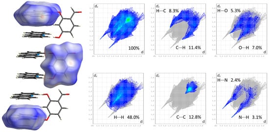 The analysis of the decomposed 2D fingerprint plots highlights the intermolecular patterns in the cocrystal of bis(ACR)–2,4DHBA [53]. The most prominent interactions are van der Waals forces (H···H contacts), which correspond to 48.0% of the total Hirshfeld surface. The C···H/H···C interactions contribute 19.7%, while the C···C interactions, involved in stacking interactions, account for 12.8%. The O···H/H···O and N···H/H···N intermolecular interactions correspond to C–H···O and O–H···N hydrogen bonds, representing the closest contacts in the structures and appearing as red spots on the dnorm surface. These interactions are visible as sharp spikes in the fingerprint plots, contributing 12.3% and 5.5% to the total Hirshfeld surface. Interactions with a contribution below 5% were omitted. All 2D fingerprint plots are shown together in Figure 8.