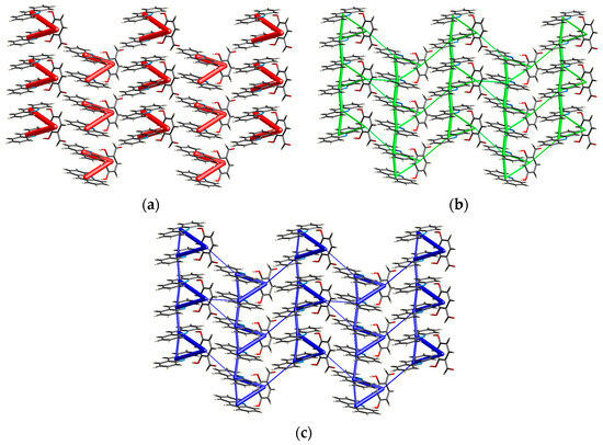 Overall, the crystal structure can be classified as a columnar type, as illustrated by the energy framework in Figure 10c. Notably, significantly stronger interactions occur along the antiparallel columnar motif in the [1 0 0] direction compared to the hydrogen bond zig-zag motif in the [0 1 0] direction, with a higher proportion of dispersion contribution (Figure 10a,b).