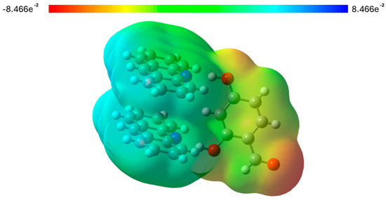 Molecular electrostatic potential (MEP) map of bis(ACR)–2,4DHBA cocrystals with corresponding isovalue contours. The color coding runs from −8.466 a.u (red) to 8.466 a.u (blue).