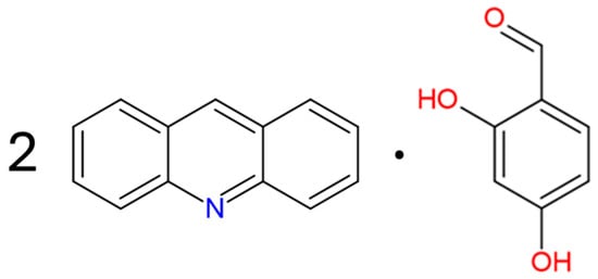 In view of the above, as a continuation of our previous study concerning multicomponent crystals formed from acridines and benzaldehydes [32], here we describe the synthesis and structural characterization of new noncentrosymmetric cocrystal derived from acridine and 2,4-dihydroxybenzaldehyde (2:1 stoichiometric ratio) (Scheme 1). In particular, we present the results of thermal, spectroscopic, and structural studies, as well as analyses of intermolecular interactions, and the Hirshfeld surface and energetic properties of the cocrystal obtained, accompanied by theoretical NLO calculations.