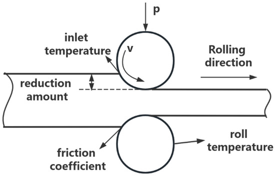 In the formula, represents the temperature, and , , and represent the density, specific heat capacity, and thermal conductivity of the rolled plate, respectively. is a weighted function, is the volumetric deformation heat rate outside the deformation zone equal to zero, and is the heat flux on the boundary surface.