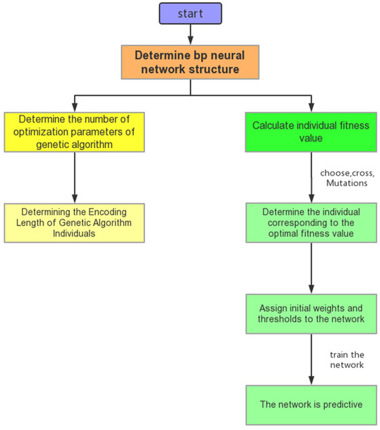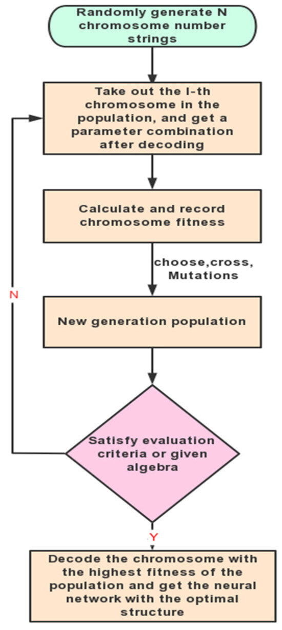 In order to improve the accuracy of the network’s predictions, we used genetic algorithms to optimize the network’s learning and structural design. By using global optimization and the implicit parallelism of genetic algorithms, the optimization speed of weight coefficients can be improved. The basic process of network optimization is shown in Figure 12.
