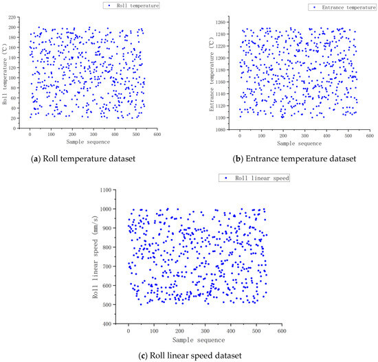 Figure 10 shows the dataset of input parameters for the neural network. The dataset includes 540 sets of data, of which 150 sets were used for testing. The test set was selected based on typical working conditions, as shown in Figure 11. Rolling mill bounce is present during the rolling process, but the amount of bounce is very small, and its impact can be considered in the impact of rolling speed on the final rolling temperature. The reduction rate in the input parameters can be represented by the preset roll spacing corresponding to the reduction rates, which were 15%, 20%, and 25%, respectively.