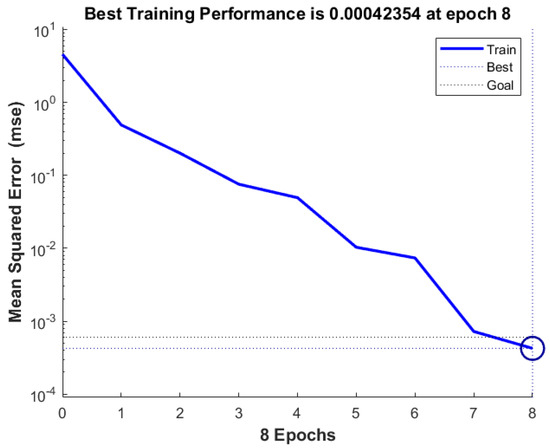 The neural network model established in this article verifies its prediction accuracy and feasibility by predicting 150 sets of final rolling temperature test sets. The fitness curve and the mean square error of the training data are shown in Figure 13 and Figure 14, respectively.