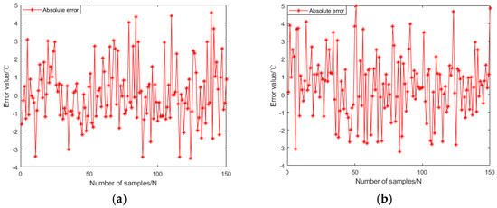 Absolute error distribution of neural network prediction. (a) Genetic algorithm optimization of BP neural network; (b) Fuzzy algorithm optimization of BP neural network.