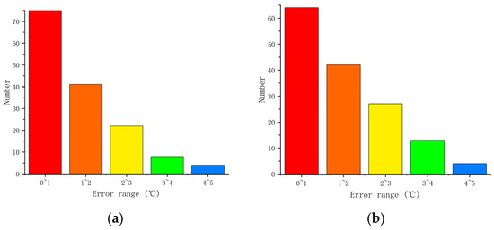 In Figure 15, it can be seen that the maximum prediction error of GABP is only 8.8 °C, while the maximum prediction error of FNNs is 10.9 °C. From Figure 16, it can be seen that the absolute error of GABP prediction is mainly concentrated at 0–1 °C, and there are only six groups of FNNs within this range.