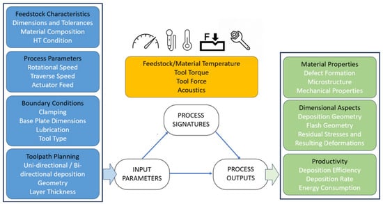The AFSD process, a thermomechanical process, is affected by key process parameters, including layer height (mainly preset), spindle speed (also known as shoulder rotation frequency), actuator speed (also known as filler material feed rate), and traverse speed [9]. The layer height indicates the measurement between successive layers in millimeters (mm), whereas spindle speed refers to the number of rotations per minute (RPM). Conversely, actuator speed refers to the millimeters per minute (mm/min) progression of feedstock to the surface along the deposition (Z) axis, while traverse speed indicates the movement rate in a layer in mm/min. All these parameters can influence the process temperature and actuator forces. For example, Schmitz et al. [10] reported overheating with an increase in the spindle speed. Clearly, a rise in temperature can negatively affect the material, while an increase in force might cause the machine’s actuator to depreciate sooner than anticipated or the deposition to fail. A detailed study conducted by Kar et al. (2023) indicates a grain refinement occurring from the substrate to the deposited layer and emphasizes that the subsequent deposition influences the preceding layer, similar to a heat treatment [11]. Another point that was emphasized was the significant plastic deformation and its advantages for the grain structure [11]. A comprehensive understanding of these inputs, outputs, and process signatures is highly significant, as illustrated in Figure 1 [7].