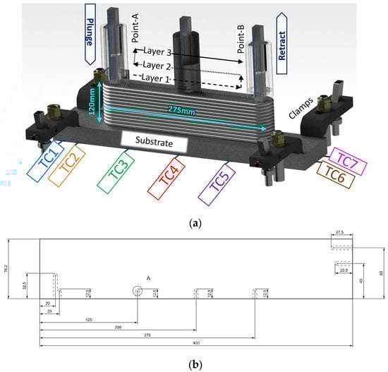 (a) Deposition strategy, specimen design, and thermocouple application, (b) thermocouple locations.