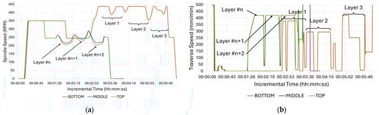 Process parameter monitoring for three positions (bottom, mid-level, and top) and three layers at each position: (a) spindle speed (rpm) and (b) traverse feed (mm/min).