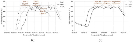 Temperature profiles for all experiments obtained from the tool thermocouple: (a) bottom and (b) top positions of the build.