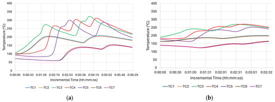 As seen in Figure 6a, the initial plunging, or engagement, takes time until it reaches the tool’s PID set point. When the tool thermocouple reaches 470 °C, TC3 reaches approximately 300 °C. Although the highest temperature peaks that are between 300 and 350 °C come from TC3, TC4, and TC5, which are closer to the deposition area than the others, they do not reach the PID set temperature, 470 °C. This is measured through the thermocouple inside the tool and corresponds to almost 80% of the melting temperature for this material. This significant finding shows the level of thermal gradient between the substrate and the deposition area close to the tool. Another important thermal gradient was experienced longitudinally. While TC3 had its valley at Point-B or at the end of the first traverse move, TC5 reached its peak at the very same time. On the other hand, the TC4 thermocouple, which was between TC3 and TC5, had its peaks just after TC3 and TC5 with some offset due to bidirectional zig-zag motion. Stubblefield et al. (2021) demonstrated similar trends along traverse direction for an AFSD simulation study on Al6061 alloy [31]. Offsets were observed among the temperature peaks of the advancing side, middle side, and re-treating side [31]. Nonetheless, the magnitude of the thermal gradients in their research was reduced because they utilized a very thin substrate (6.35 mm), resulting in faster overall heating. Among the corner thermocouples, TC1 and TC2, being close to the long edge, showed slightly higher peaks than TC6 and TC7, which were located on the short edge. This is expected due to their position on the periphery (Figure 6a). The peak times of TC1 and TC2 were identical to TC3. Still, the magnitude of their peaks at approximately 200 °C was significantly lower than the maximum temperature reached with TC3. When the maximum tool temperature of 470 °C is considered, the extreme thermal gradient for the whole structure can be appreciated. As the height of the deposit increases, the substrate thermocouples’ distance with the friction area increases too. Thus, the maximum temperature sensed decreased to 250 °C (Figure 6b), where it was above 300 °C (Figure 6a) at the beginning of deposition. This difference is mainly attributed to the loss of heat due to thermal conduction. As the max temperature values decreased, the difference between the start of each layer and its peak became smaller. This difference is even negligible at the top of the deposition. Exp-2, which uses the same parameters without a PID control, showed similar gradient variations.