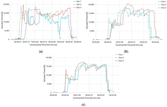 Force profile for all experiments obtained from the tool thermocouple: (a) bottom, (b) middle, and (c) top.