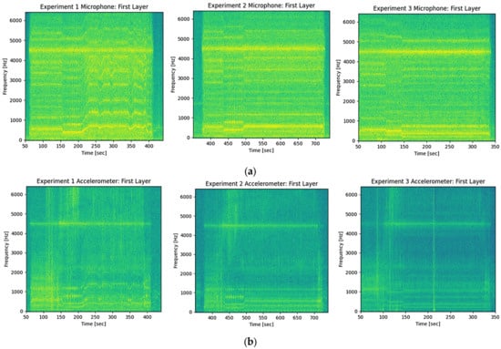 Recordings from all experiments at the first layer (a) acoustic sensor and (b) accelerometer for vibration monitoring.