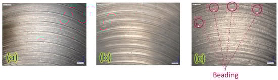 Conversely, the pitch distances varied significantly. It was observed that the upper surface of the Exp-1 specimen exhibited variable pitch distances as a result of the use of the PID controller on process variables. Exp-2 and Exp-3, in which PID was not activated, demonstrated constant pitch distances at various locations. The pitch distance of Exp-3 was lower as its spindle speed was set to a higher level. The rise in spindle speed for Exp-3 resulted in additional rotations for the same traverse distance, causing overheating. Moreover, Exp-3 exhibited uneven and incomplete rings with some drop-like formations that were scattered randomly (see Figure 11c). This finding is in line with previous literature, as Merritt et al. (2022) reported similar outcomes, named them as “beading”, which was mainly attributed to the overheating [18].
