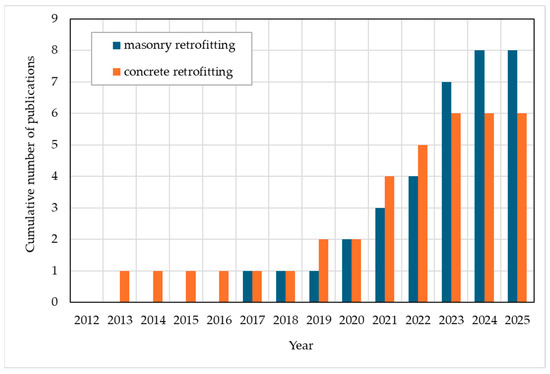 Cumulative number of publications concerning structural retrofitting of masonry and concrete members with TRAAM over the last 13 years.