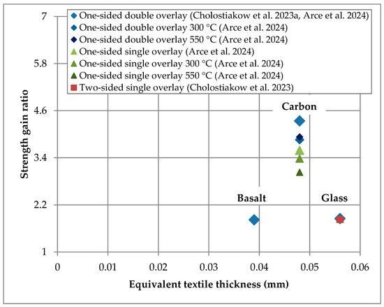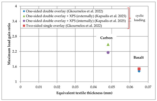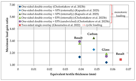 Most of the results presented in the current and previous section are gathered in Figure 4 and Figure 5 that depict the maximum load gain ratio versus the equivalent textile thickness of the TRAAM-strengthened walls subjected to in- and out-of-plane bending, respectively. It is noted that the results of Figure 4 regard specimens subjected to cyclic in-plane loading, while those of Figure 5 represent specimens subjected to monotonic out-of-plane loading, except in the case of wall reinforced with the two-sided basalt TRAAM overlay that was subjected to cyclic loading (i.e., [28]). It is also pointed out that in the absence of a control specimen in the study of Cholostiakow et al. (2023b) [29] (i.e., un-strengthened wall), the related load gain ratios have been computed based on the theoretically estimated value of that specimen’s maximum load. Regarding specimens subjected to in-plane bending (Figure 4), it appears that those strengthened with a carbon TRAAM overlay present higher load gain. It is also observed that the combination of TRAAM overlays with insulation boards can potentially limit the efficiency rate of the strengthening system when boards are applied between the substrate and the overlay (internally). In the case of out-of-plane bending (Figure 5) and regarding the presence and position of insulation boards in relation to TRAAM overlays, it is verified that specimens with no insulation or with boards applied on top of the TRAAM overlays (externally) present lower load gain ratio than those in which the board is applied internally or between two TRAAM overlays. As mentioned above, this fact is attributed to the longer lever arm from the axis of rotation to the TRAAM overlay. In addition, the comment about the relation of the carbon fiber textile to the highest load gain ratio still applies when TRAAM-strengthened walls are subjected to out-of-plane bending. Finally, it is concluded that the strength gain ratio cannot be correlated either with the equivalent textile thickness when textiles with different fibers are considered, or with the flexural/compressive matrix strength (see Figure 4 and Figure 5 and Table 2 and Table 3).