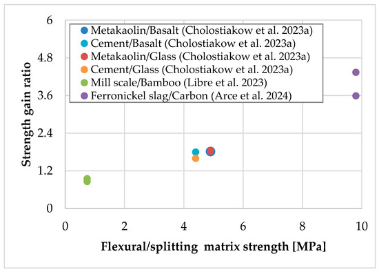 Strength gain ratio versus flexural/splitting matrix strength of TRAAM- and TRCM-strengthened walls subjected to diagonal compression [25,26,27]. (Note: all overlays’ configurations have been included for each TRM system.)