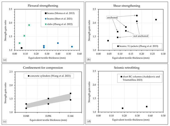 Load gain ratio versus equivalent textile thickness of TRAAM-strengthened concrete elements: (a) flexural strengthening; (b) shear strengthening; (c) confinement for compression; (d) seismic retrofitting [32,33,34,35,36,37].