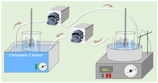 For the static adsorption experiments, 150 mL of a certain concentration of gold standard solution was placed in a 200 mL beaker, and a certain amount of activated carbon added. For conventional adsorption, the beaker was positioned within a thermostatic water bath; for ultrasonic-assisted adsorption, the beaker was placed in an ultrasonic cleaner, as shown in Figure 1. Mechanical stirring, operating at 200 r/min, was uniformly applied to both conventional and ultrasound-assisted adsorption. The adsorption solution was subjected to filtration for activated carbon removal when the adsorption was completed, after which the filtrate was analyzed for the pH value, free cyanide concentration, and gold concentration using standardized analytical protocols.
