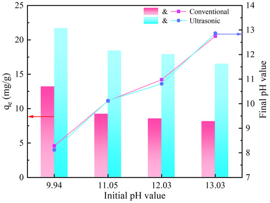 The solution pH is one of the important factors affecting the adsorption process, so the effect of the initial solution pH on the gold adsorption was studied. Since more than 50% of CN− exists in the form of HCN when the pH is lower than 9, and the actual cyanide leaching of gold is usually carried out at a pH above 10, the experiments in this section were carried out in the pH range of 9.94–13.30. As shown in Figure 2, the adsorption of gold on the activated carbon decreased gradually with the increase in pH, whether with and without ultrasound. In addition, the adsorption capacity of the ultrasound-assisted adsorption was significantly better than that of the conventional adsorption under different pH conditions. Among them, the adsorption of gold reached a maximum value of 21.7 mg/g and 13.2 mg/g at an initial pH of 9.94 in both the presence and absence of ultrasonic waves, respectively. At the same time, after the adsorption under different initial pH, the solution pH value was reduced and the pH change trend in the solution was similar, whether with or without ultrasound. The point of zero charge (pHPZC) is a significant determinant affecting the surface charge of the adsorbent. As shown in Figure 3, the pHPZC (measured with activated carbon “as is”) of the activated carbon was determined by the pH drift method to be 7.17. When the solution pH is higher than 7.17, the activated carbon is easy to deprotonate, resulting in its surface being negatively charged and electrostatically repulsive to Au(CN ions, and the pH of the solution gradually decreases. Accordingly, the higher the pH of the solution, the less favorable it is for the adsorption of Au(CN [14,15]. Taking into account the safety and adsorption effect, the pH of the solution was fixed to 9.9 in the subsequent adsorption experiments.