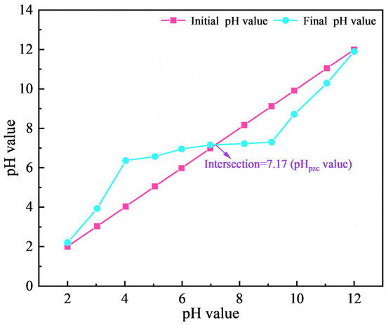 The point of zero charge (pHPZC) of activated carbon was determined by the pH drift method, as follows: 0.2 g of activated carbon was added to a series of 100 mL 0.1 mol/L KCl solutions, and the initial pH of the solution was adjusted to 2.00, 3.03, 4.03, 5.05, 5.98, 6.98, 8.17, 9.12, 9.91, 11.05, and 12.00 by adding 1.0 mol/L HCl or NaOH solution. After being placed in a shaker for 24 h, the pH of the supernatant was measured by a pH meter. The pHPZC value of the activated carbon is identified at the intersection point where the initial pH curve meets the final pH curve.