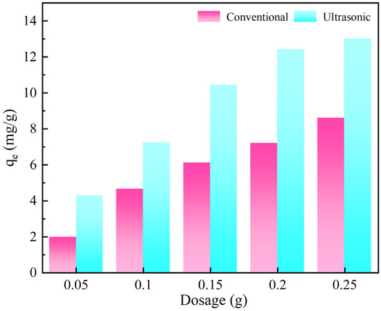 The effect of activated carbon dosage on gold adsorption is shown in Figure 4. Regardless of the presence or absence of ultrasound, the gold adsorption by the activated carbon increases gradually with the increase in activated carbon dosage. This is attributed to the limited saturation adsorption capacity of activated carbon; increasing activated carbon dose can lead to a larger specific surface area and more available adsorption sites. Using different dosages of activated carbon, the adsorption amount of activated carbon to gold under the ultrasonic action is higher than that of conventional adsorption, indicating that ultrasound obviously promotes gold adsorption. Due to the adsorption amount of 0.25 g, the activated carbon was not significantly higher than that of 0.2 g under the ultrasonic action; thus, 0.2 g activated carbon was used for subsequent adsorption experiments.
