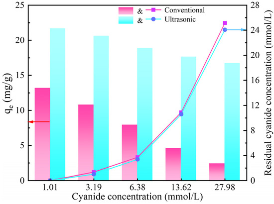 Ion strength usually influences adsorption, as the different ions may compete for adsorption sites on the adsorbent. Therefore, the effect of CN− concentration on gold adsorption by activated carbon was investigated and the experimental outcomes are presented in Figure 5. With the increase in CN− concentration in the solution, the adsorption capacity of the activated carbon for gold gradually decreased, and the decreasing trend was more obvious in the conventional adsorption. In addition, the adsorption capacity of the activated carbon for gold under ultrasonic action was obviously higher than that of conventional adsorption, and the difference was more obvious with the increase in CN− concentration. By monitoring the CN− concentration changes in the solution before and after adsorption, it was found that the CN− concentration obviously decreased after adsorption. Furthermore, CN− concentration was slightly lower than that of conventional adsorption under ultrasonic action, indicating that CN− could form competitive adsorption with Au(CN, which was also confirmed in the literature [16,17]. Considering that the adsorption capacity of the activated carbon for gold and CN− was improved by ultrasound, the ultrasonic cavitation effect enhances the adsorption performance through the following pathways: