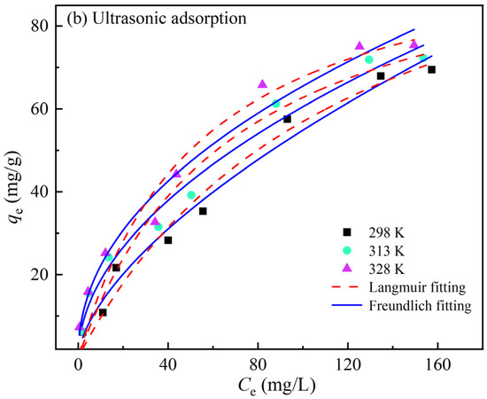 The adsorption isotherm is an important curve to characterize the adsorption state. To further investigate the relationship between the equilibrium adsorption amount of the activated carbon and gold concentration in the solution, the adsorption experiment using gold standard solutions with different Au(CN concentrations was carried out at 298, 313, and 328 K, and the isotherm data were described by Langmuir and Freundlich isotherm models. The Langmuir model, expressed as Equation (3), posits that the adsorbing molecules are adsorbed on the homogeneous surface of the adsorbent in a single molecular layer, and there is no interaction between the adsorbing substances. The Freundlich model, which can be expressed as Equation (4), provides a suitable framework for the adsorption of adsorbates on the non-homogeneous surface of the adsorbent, where adsorption capacity is significantly influenced by the chemical properties of the adsorbent surface and the interaction between the adsorbates [7,18]. By fitting the adsorption data and calculating the isotherm parameters by two models, the results are shown in Figure 6 and Table 2 and Table 3. The linear correlation coefficient R2 value for the Freundlich model is higher than that for the Langmuir model, whether with or without ultrasound, and the calculated adsorption amount is very close to the experimental data. Therefore, the Freundlich model is more suitable than the Langmuir model to describe the adsorption behavior of Au(CN on activated carbon, indicating that the adsorption is not a single-molecule physical adsorption, but a multi-molecule chemical adsorption. In addition, the saturation adsorption amount of gold on activated carbon increases under progressively higher temperature conditions, and the adsorption capacity of the activated carbon for Au(CN could be obviously improved by ultrasound, and the equilibrium loading amount of gold was increased by about 37% under the ultrasonic action.