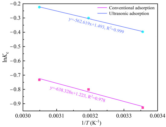 For the purpose of describing the adsorption properties of activated carbon, the thermodynamic equation shown in Equations (5)–(8) was further used to analyze its thermodynamic parameters ∆Go, ∆Ho, and ∆So [9,19]. As shown in Figure 7 and Table 4 and Table 5, it can be found that ∆Go are all positive values, which is contrary to the conclusion of most researchers. Their research results show that ∆Go is usually negative in the adsorption reaction process, indicating that the adsorption reaction is feasible and spontaneous [14,15,20]. However, from the calculation process of ∆Go shown in Equations (5) and (6), if the adsorbent has sufficient adsorption capacity for the adsorbate, Kc will be greater than 1; thus, ∆Go will be negative. On the contrary, if the adsorbent has limited adsorption capacity for the adsorbate, Kc will be less than 1, and ∆Go will be positive. Therefore, whether the adsorption reaction can be spontaneous is not the only factor affecting the sign of ∆Go; however, the more negative the ∆Go value, the stronger the adsorption capacity of the adsorbent for the adsorbate. For example, the calculation results show that ∆Go is more negative under ultrasonic action than under conventional adsorption, indicating that the adsorption capacity of activated carbon for Au(CN is enhanced by ultrasound, which is consistent with the actual adsorption experiment results. Similarly, the work of Sedira et al. [21] and Adebisi et al. [22] demonstrates that the positive ∆Go reflects limited thermodynamic spontaneity of the adsorption process rather than its non-spontaneity. The adsorption of Au(CN) on activated carbon is a heat-absorption reaction, as evidenced by all the positive ∆Ho values, which aligns with experimental results, confirming that increasing the temperature favors the adsorption process. A positive ∆So is observed during the adsorption process of Au(CN on activated carbon, indicating elevated degrees of freedom at the solid–liquid interface [23].
