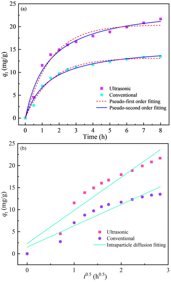Adsorption kinetics can explain the adsorption mechanism [20]. With the aim of further understanding the difference in the adsorption kinetics of activated carbon for Au(CN with and without ultrasound, pseudo first-order (Equation (9)), pseudo second-order (Equation (10)), and intraparticle diffusion (Equation (11)) models were used to simulate the adsorption kinetic data. Figure 8 and Table 7 and Table 8 present the fitting results and kinetic parameters [15]. The adsorption kinetics of Au(CN on activated carbon are predicted with a certain deviation by the pseudo first-order model, which underestimates the adsorption amount in the gradual equilibrium stage. From the linear correlation coefficient R2 value, it is apparent that the adsorption kinetics of activated carbon for Au(CN are closer to the pseudo second-order kinetic model for both situations, with or without ultrasound. This demonstrates that the adsorption of activated carbon for Au(CN is dominated by chemical adsorption, and electron sharing and ion exchange may occur between the activated carbon and Au(CN in this adsorption process [1,20]. Therefore, the better adsorption effect under the ultrasonic action can be attributed to the fact that the specific surface area of the activated carbon is increased by ultrasound, which makes the activated carbon possess more active sites per unit mass that can bind to Au(CN. For the intraparticle diffusion model, if the relationship between qt and t0.5 passes through the origin, the rate-limiting step is governed by the intraparticle diffusion [15]. However, as shown in Figure 8b, the fitting results deviate from the origin, and the R2 values are only 0.92 and 0.90 under the presence and absence of ultrasound, respectively, indicating that the adsorption of Au(CN on the activated carbon is not controlled by intraparticle diffusion.